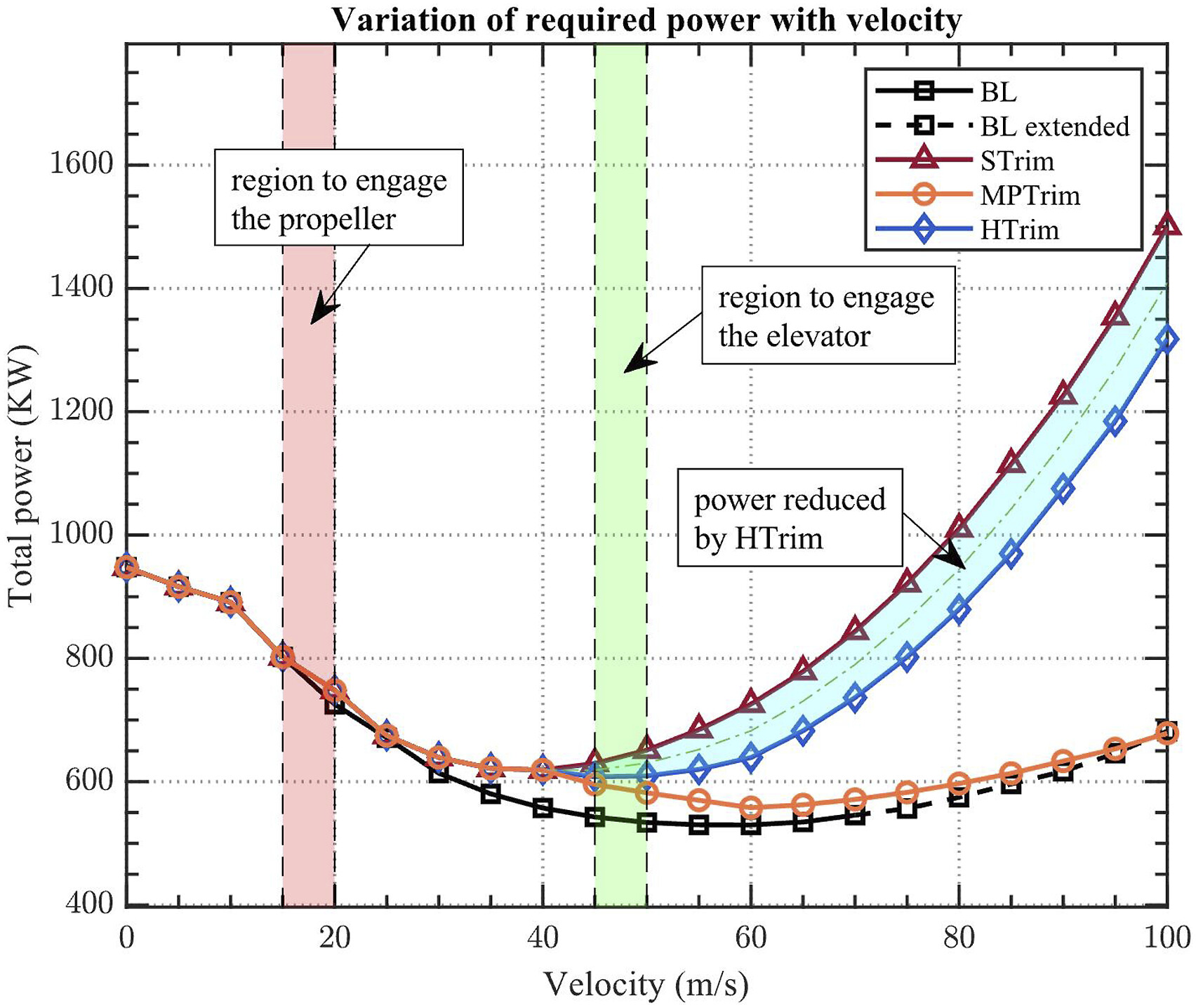 Interest in the coaxial compound helicopter (CCH) has been increasing in the civil aviation and engineering community for its high-speed and high-maneuverability features, and is likely to continue to do so for the foreseeable future. Since the control in CCH is totally different from the conventional helicopter, the redundant control strategy design is one of the biggest challenges. In this study, the CCH model based on XH-59A is built to investigate the impact of the propeller and the elevator on the flight performance. Four trim strategies with different objectives are proposed and then compared to find the optimal control allocation. A heuristic descent search method is applied to search the optimal velocity at which the propeller and the elevator are engaged. A significant improvement of power required at medium- and high-speed with acceptable rotor airloads increment was found by using the Hybrid Trim strategy in the speed range of 0–100 m/s, with regard to a pre-configured pitch angle schedule. The corresponding control variables obtained located in a reasonable control range, with a maximum power reduced of 13% at 100 m/s, which showcase the potential of the Hybrid Trim strategy.